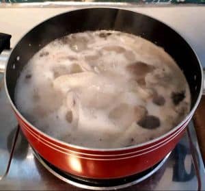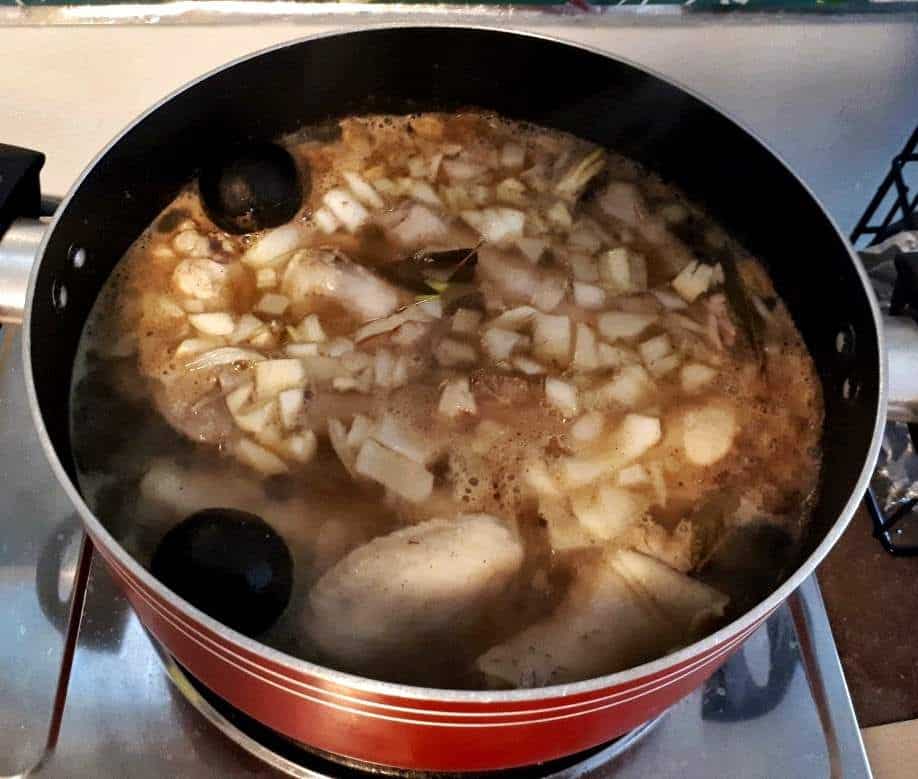 - Once the excess fats are removed, add the spices, onion, and garlic into the boiling pot. Let it boil for 45 minutes or until the chicken is soft.