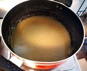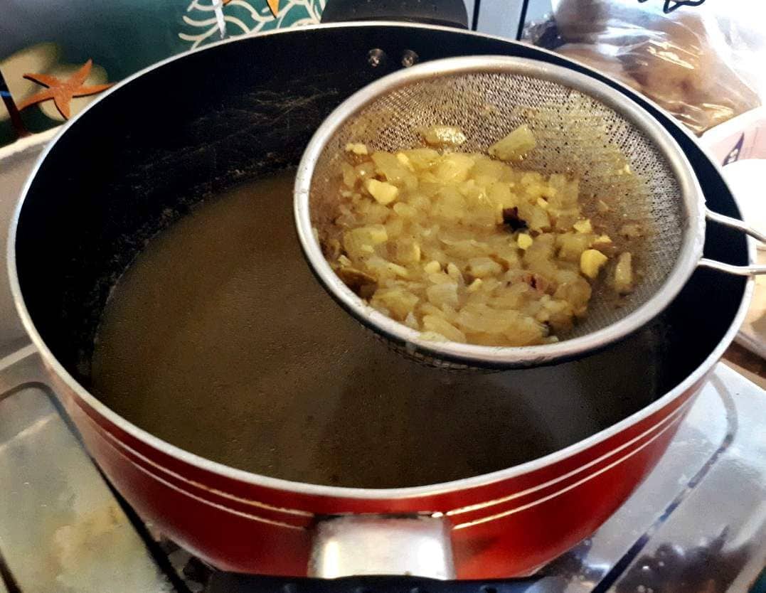 - Remove the onion, garlic, and other solid ingredients. Separate them from the Chicken Stock for later use