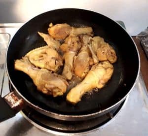 - While the rice is boiling. Add oil in the separate pan, and fry chicken to have a nice brown crispy texture