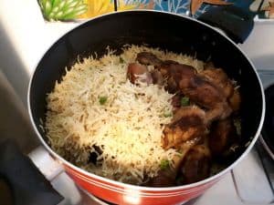 Once the chicken is fried, wait till the rice is cooked. After the rice is almost cooked, add the chicken and fried onion above the rice. You can optionally mix the rice or leave it that way and you are done.