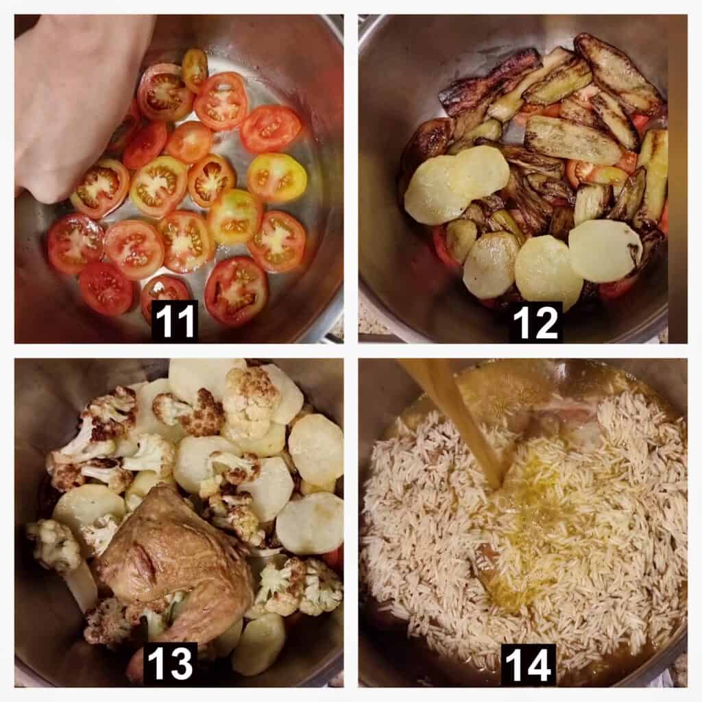 In my experience, your rice might become dry if you only air-fried the vegetables and the chicken. I highly recommend frying them in oil instead, as this is what gives the moist texture to the maqluba.