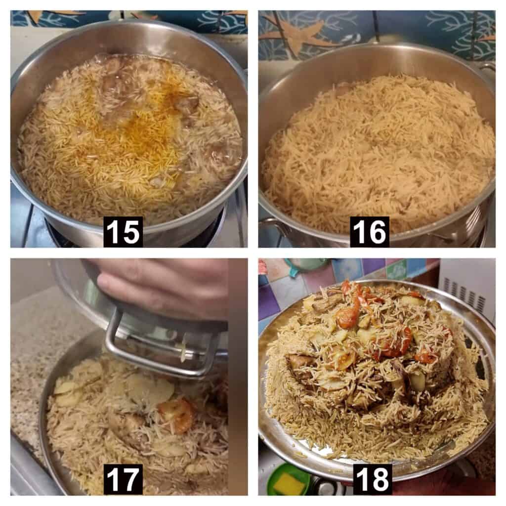 - For the final layer, the spiced rice is added, and then 4-5 cups of broth used to boil the chicken are poured over it.