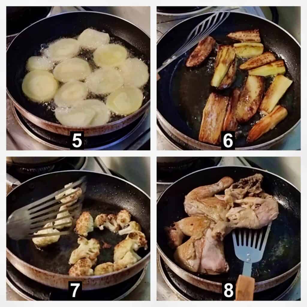 - While the chicken is boiling, chop the cauliflower, slice potatoes, and eggplant into long shapes. Heat vegetable oil in a separate pan for frying.