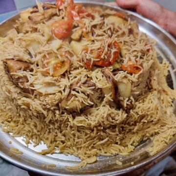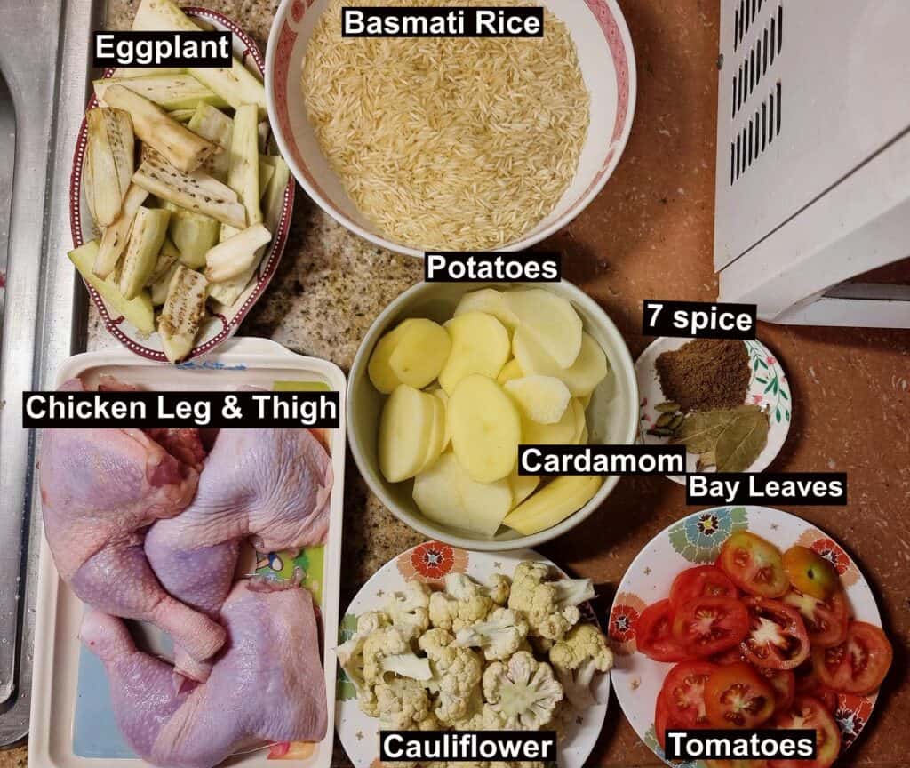 Vegetables: I use three important vegetables for this recipe—potatoes, eggplants, and cauliflower. It is important to fry them first before adding them to the pot, as it gives a nice brown texture and helps keep the rice moist.