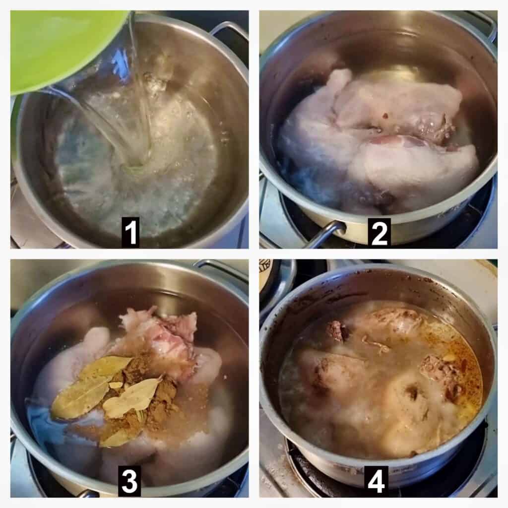 - Prepare a large pot for boiling the chicken with water. Remove any excess fat once the chicken starts boiling.