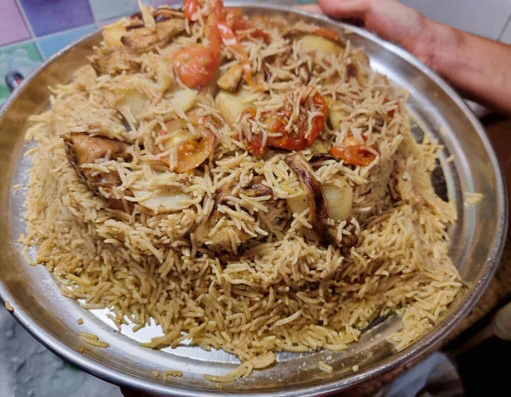 What makes this food delicious is that the chicken is boiled along with the spices to enhance the flavor, producing a rich, savory broth for the rice. For some people, Maqluba is considered a heavy and oily dish because the vegetables and chicken are fried in oil before assembling into layers. However, this is what makes the food mouthwatering, as the rice is so moist that you don’t need any sauce or stew to feel satisfied