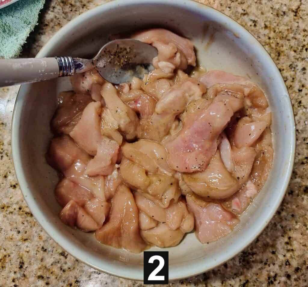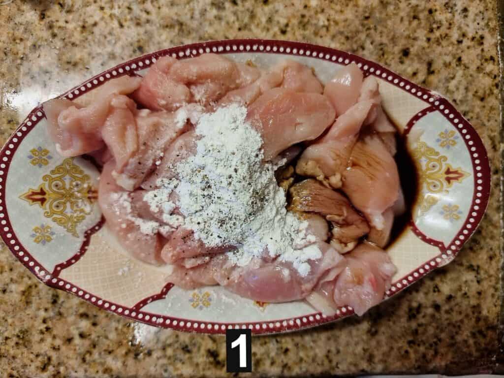 - To marinate the chicken, I combined the chopped chicken breast with cornstarch, soy sauce, and black pepper. Stir to mix gently and then set it aside.