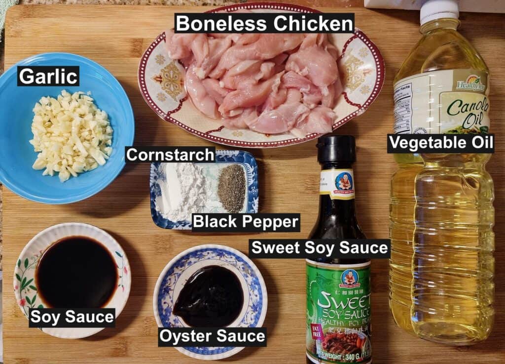 - Condiments: To add umami & sweet flavors, I use sweet soy sauce, oyster sauce, and dark soy sauce. These 3 seasoning sauces will enhance the flavor of my chicken.