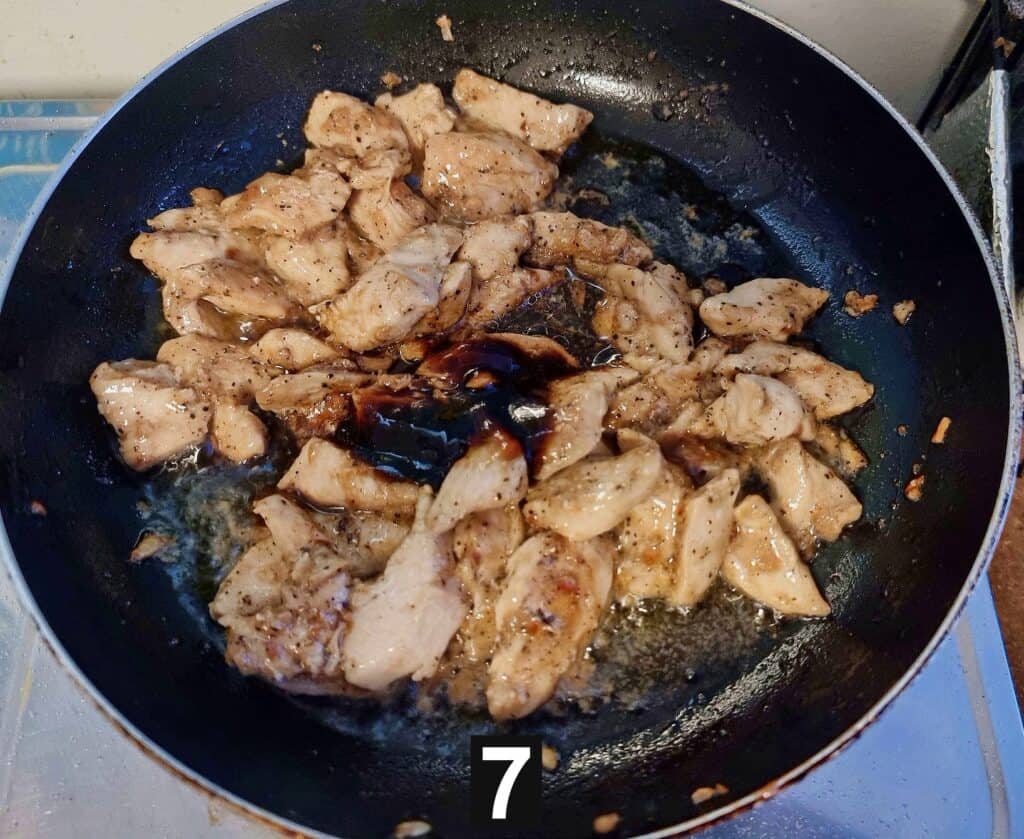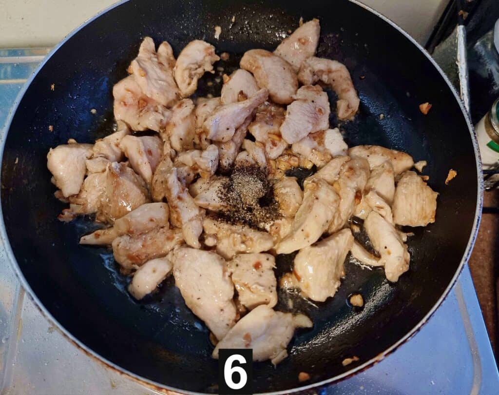 - Next, add the marinated chopped boneless chicken breast and give it a quick stir before adding the black pepper. Mix to stir gently.