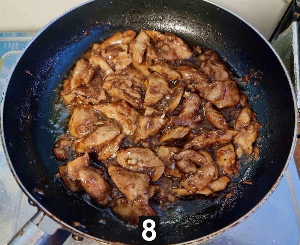 - Next, I added the marinated chopped boneless chicken breast which I gave a quick stir before adding the black pepper. Mix to stir gently.