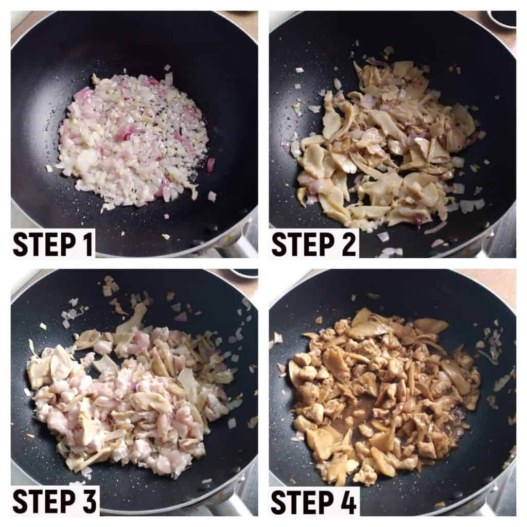 Firstly, I pour vegetable oil and when it is hot, I added chopped garlic and onion. Next, I added chopped mushroom and have it stirred for 5 minutes before I added the chicken breast. Stir till the chicken is almost cooked.