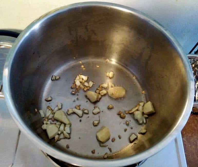 - Add vegetable oil to a cooking pot in medium heat. Once hot, add ginger and chopped garlic. Stir for a minute.