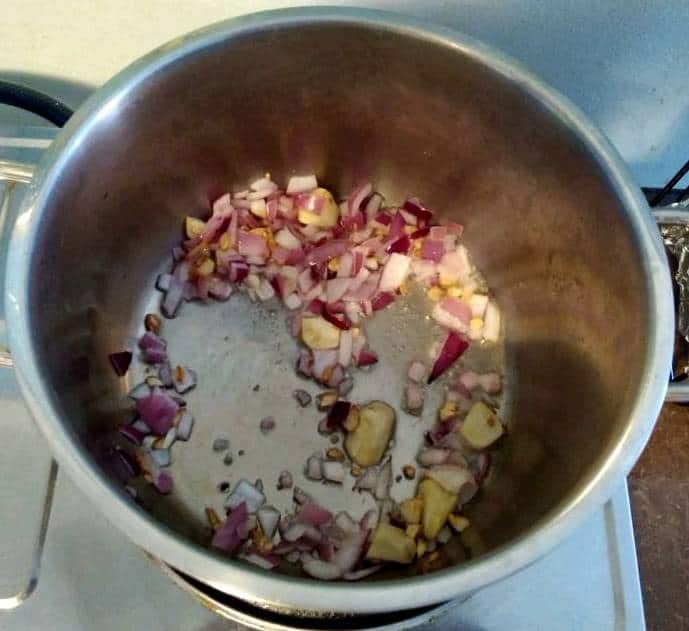 - Add chopped red onion. Give a quick stir till it turns transparent.