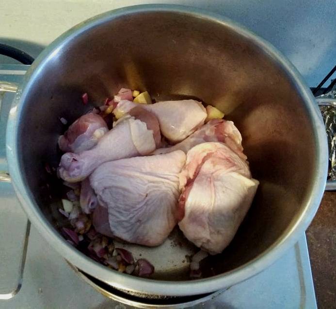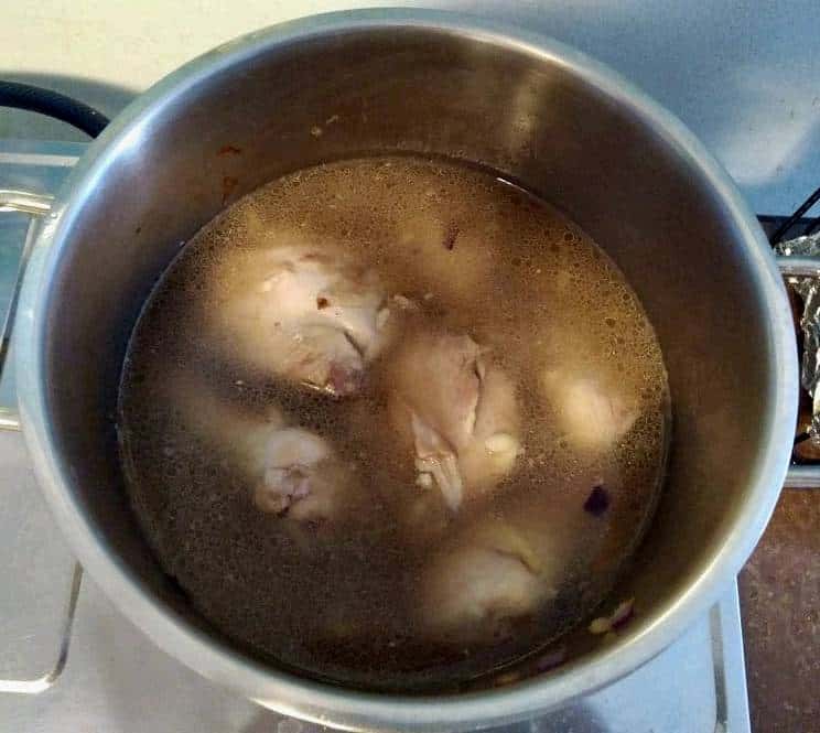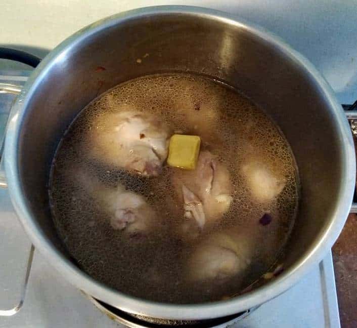 Next, I add the chicken drumstick and thigh and stir it before I pour water. Next, when the water started to boil, I added the fish sauce and chicken bouillon cubes. And then I let it simmer for 15-20 minutes or until the chicken is cooked.