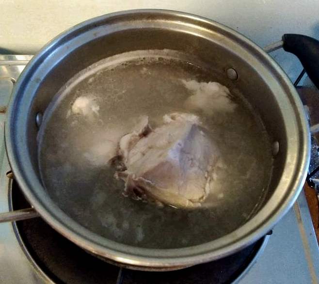 - Pour water and chicken breast into a large pot.