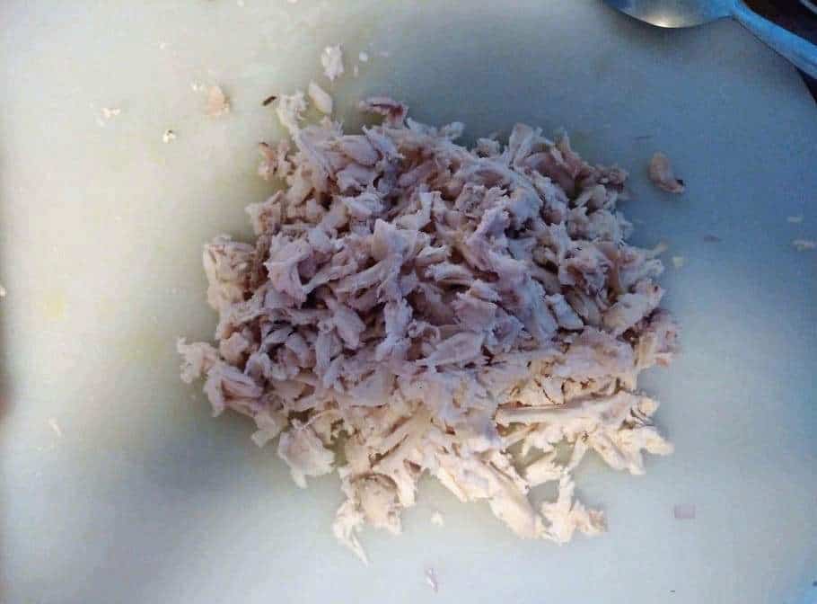 - Drain the water and transfer the meat to the plate. When it cools down, that's when I manually shred the chicken into smaller pieces using my hand. You can use a fork or knife if you prefer that way.