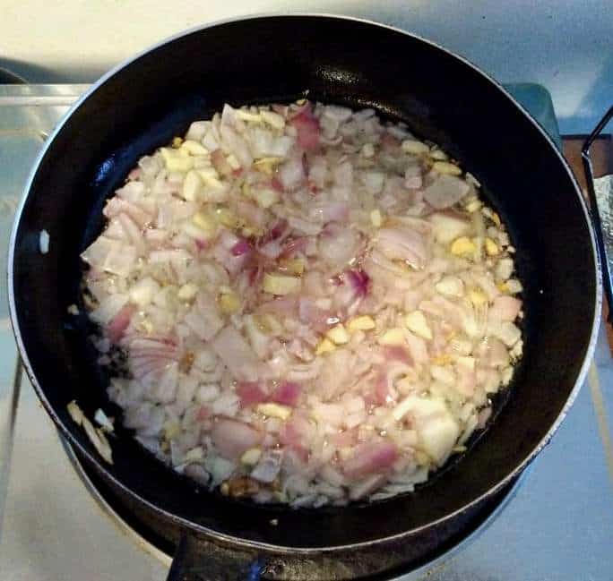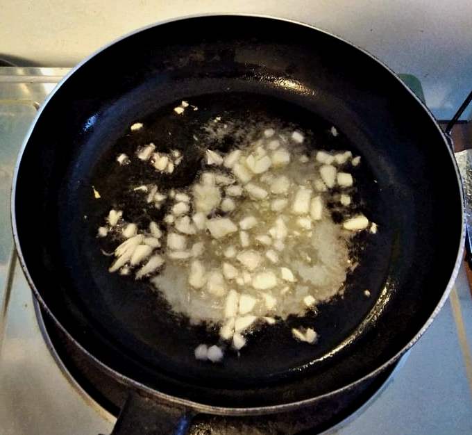 - In a large pan in medium heat, I add vegetable canola oil and when it turns hot, that's when I add chopped garlic and onion. Stir for few minutes till it turns translucent.