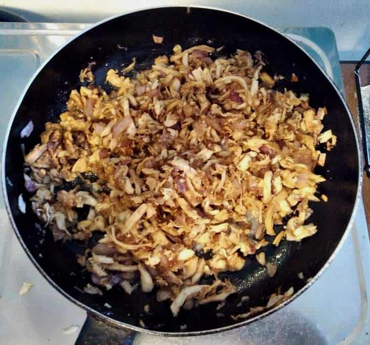 The shredded meat could either be chicken, beef, or fish, which they call kagikit. To make the meat, it is sauteed in vegetable oil with onion, garlic, and soy sauce until it turns brown.