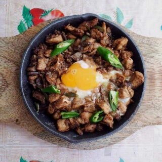 Sisig is a Filipino dish that is made from a mixture of a combination of chicken liver and other meat parts. It is seasoned with calamansi, soy sauce, onion, green chilies, and mayonnaise. Lastly, when serving this dish, we like to sizzle it in the cast iron pan and add an egg on top of it.