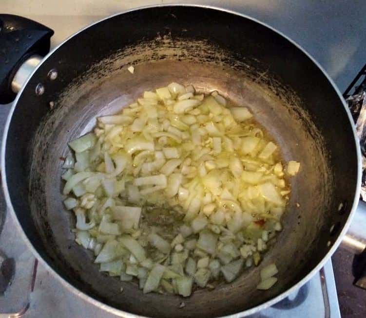In a different pot, I add olive oil and then chopped garlic and onion. Stir for few minutes till they both look transparent and cooked.