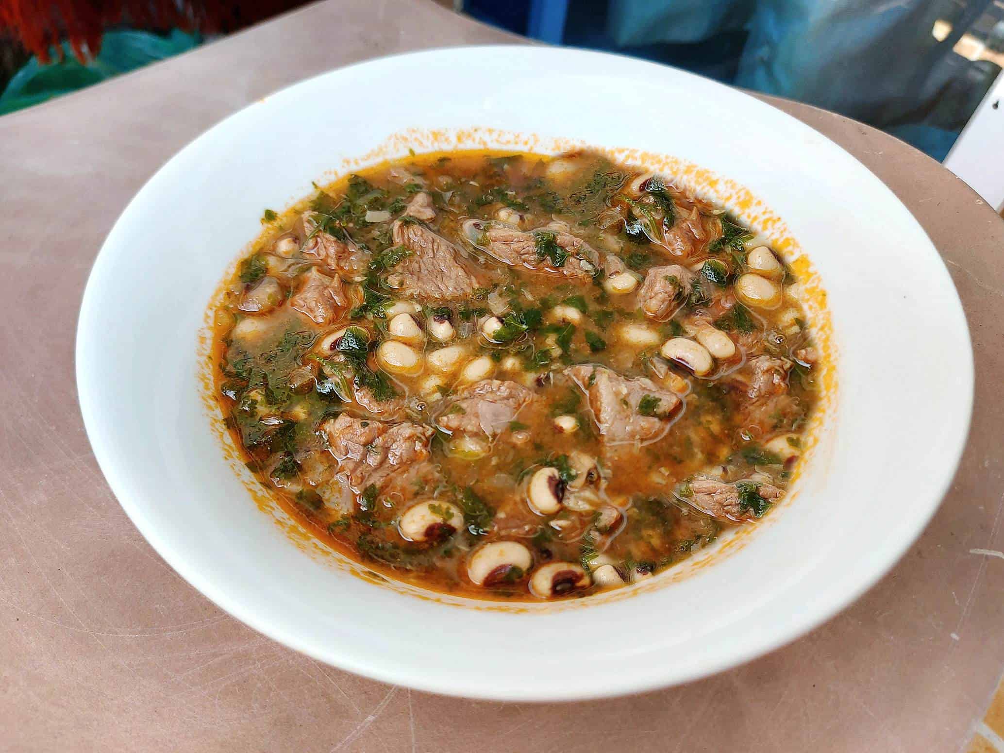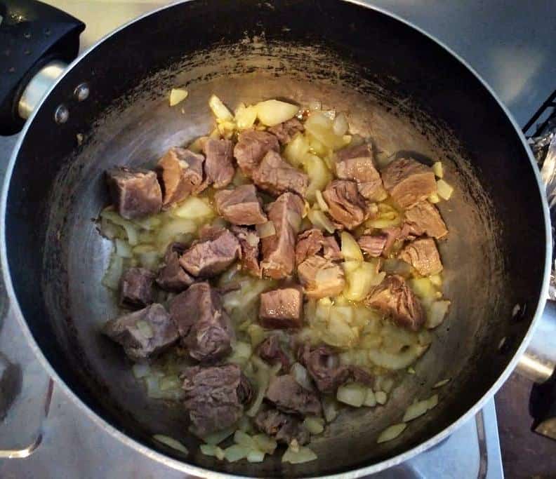 - Next, I add the beef cubes and black-eyed beans. Stir gently before adding the tomato paste.