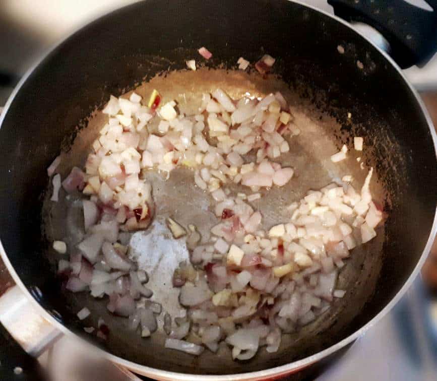 - Add 3 tablespoon of vegetable cooking oil in the pot. Once it is hot, add onion and garlic. Stir for few minutes or till it is almost cooked