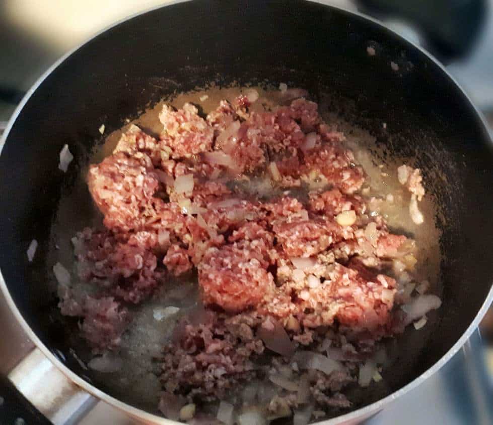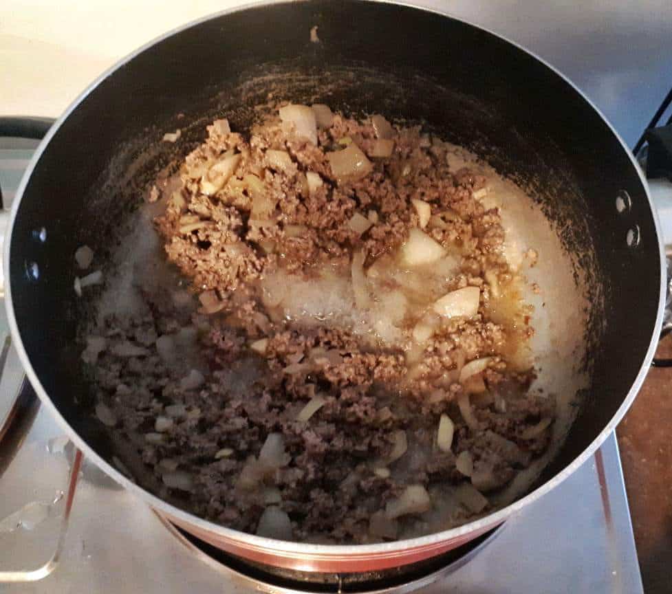 - Add ground beef and give it a quick stir. Let it saute for 5 minutes or till the juices of the ground beef is almost evaporated.