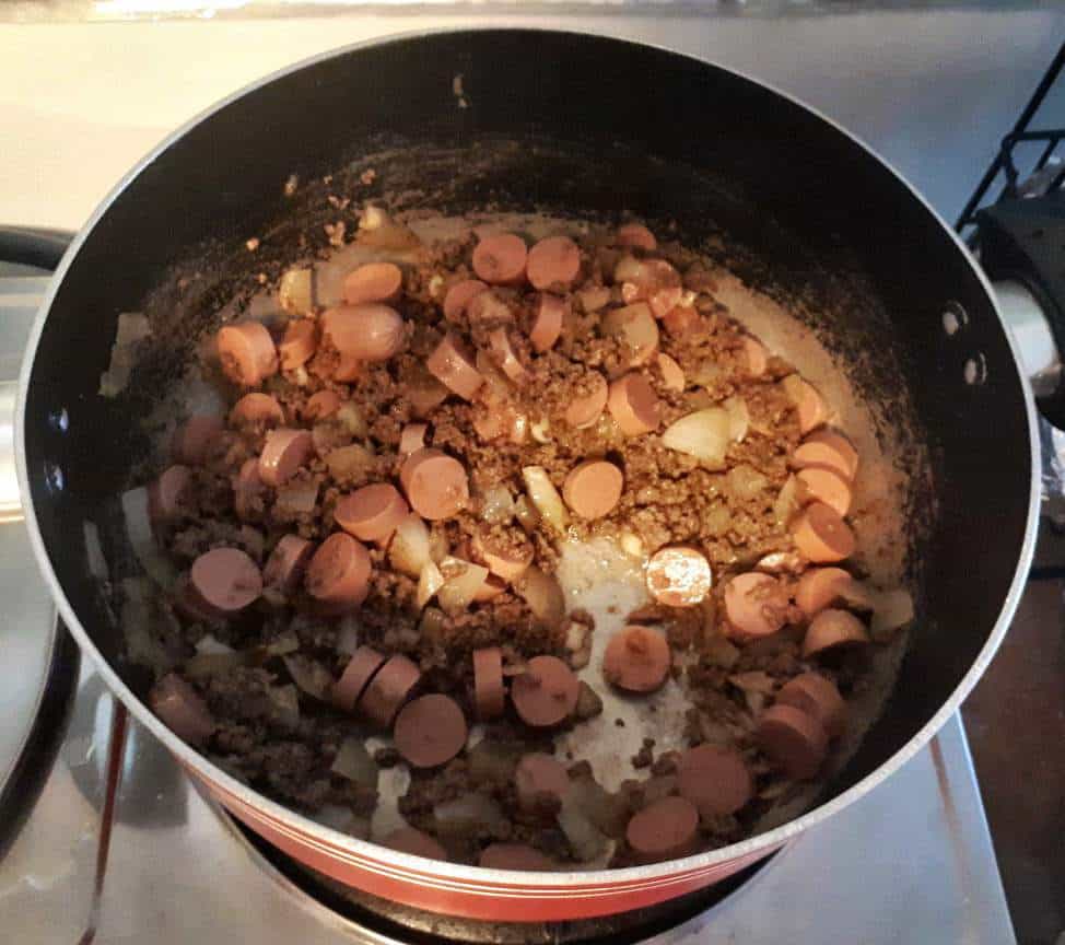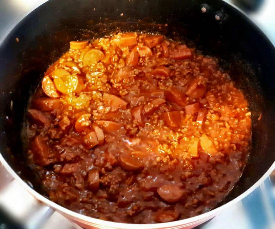 - Pour the ketchup and pasta / tomato sauce. Slowly mix with the ground beef and hot dog mixtures.