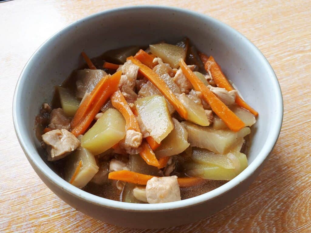 Ginisang Sayote with Chicken is a Filipino sauteed vegetable dish that contains chopped chicken breast, tomatoes, chayote, carrots, oyster sauce, and sesame soil. This recipe is traditionally served and eaten with white steamed rice.
