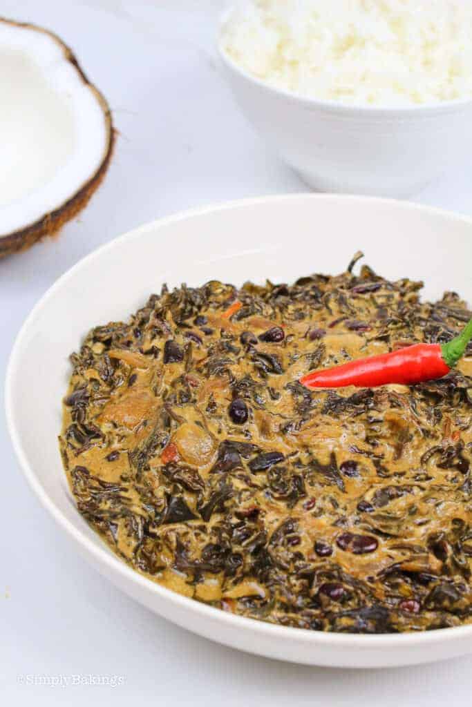 This is a Filipino shredded or whole taro leaves that are cooked in coconut milk, and it is spiced with lemongrass, onion, garlic, ginger, labuyo chili, and shrimp bagoong. Like most Filipino dishes, this is commonly eaten and served with rice.