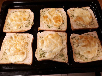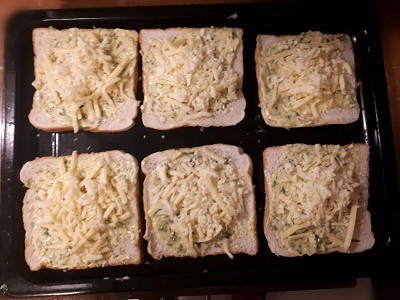 I wouldn't bother with the cheese. Garlic bread doesn't have cheese on it. Also on the BBC Kitchen Cabinet show the consensus was that the butter should be in the bread not on it so I would suggest putting another slice on top so that you have an unbuttered top and bottom. I've not tried doing sliced bread garlic bread but I might try it tomorrow but what I'm going to do is use three slices of bread one on top of the other. The inner pieces with be buttered leaving the top and bottom dry. That will make the bread thicker with plenty of garlicky butter inside, and then do it in the oven as suggested.