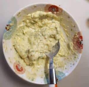 Add the butter, mashed garlic, olive oil and chopped parsley in a plate bowl.