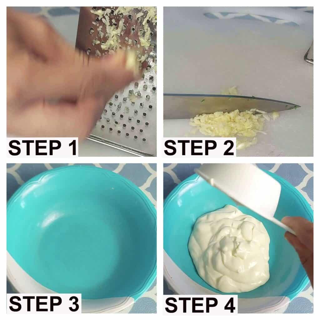 - If you are not using a blender, you can just mix everything in a plate bowl. Firstly, make sure you grate the garlic into a paste before you started making this white sauce.