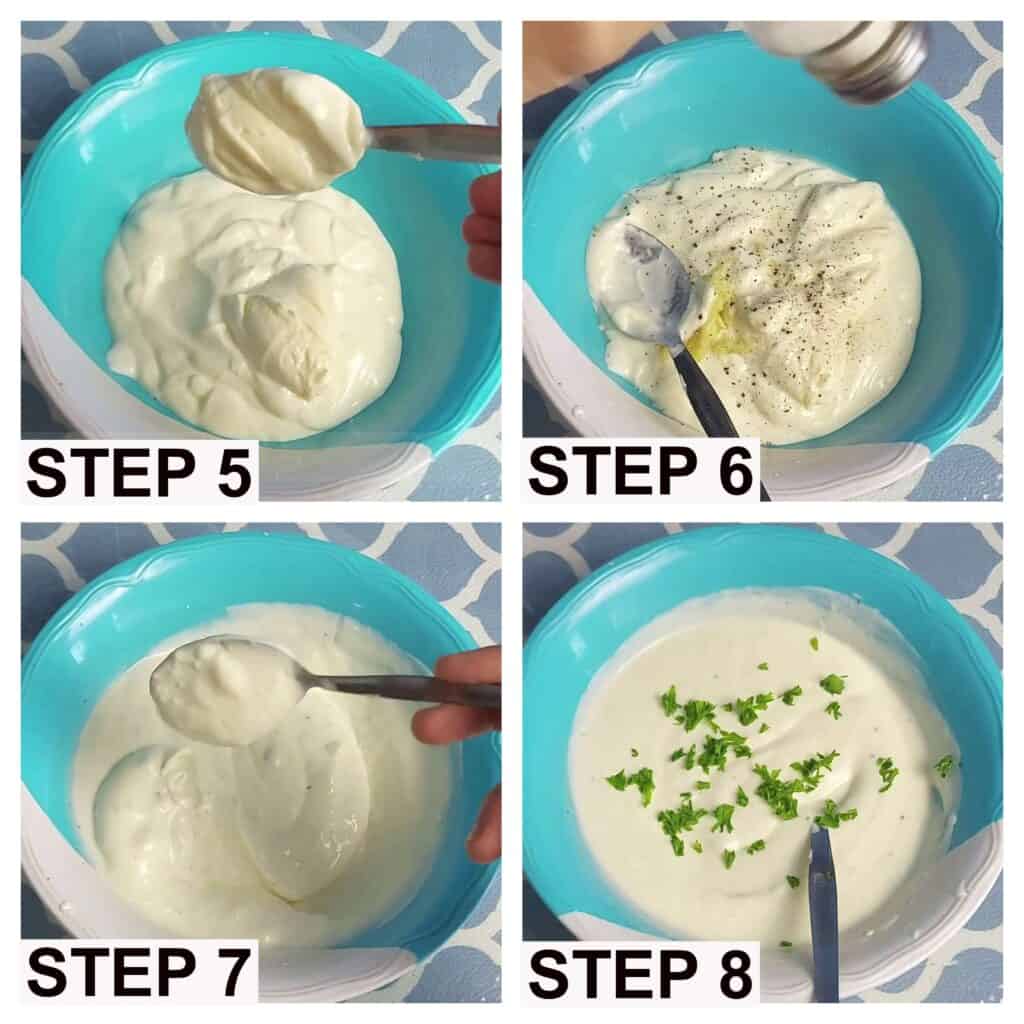 - Pour the yogurt, add mayonnaise, grated garlic, lemon juice, salt and black pepper in a plate bowl. Stir to mix