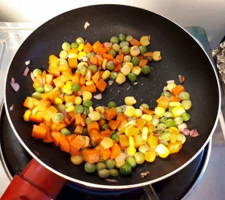 Firstly, add the oil in the pan. Once it is hot enough, add the onion and stir for a few minutes till it turns light brown. Later, add the frozen mixed vegetable and again stir for several minutes till it is cook.