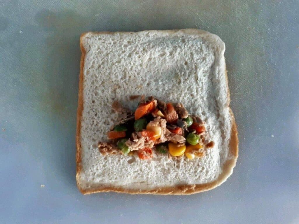 - Add 1 to 1.5 tablespoon of tuna spread mixture in the sliced bread. Fold it together and use the fork to seal it by pressing the edge of the bread.