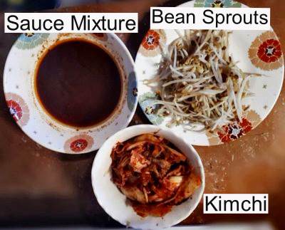- Add the kimchi in the frying pan, and stir until it almost cooked. Later, add the bean sprout, and mix it well. Let it cook for 2 to 3 minutes.