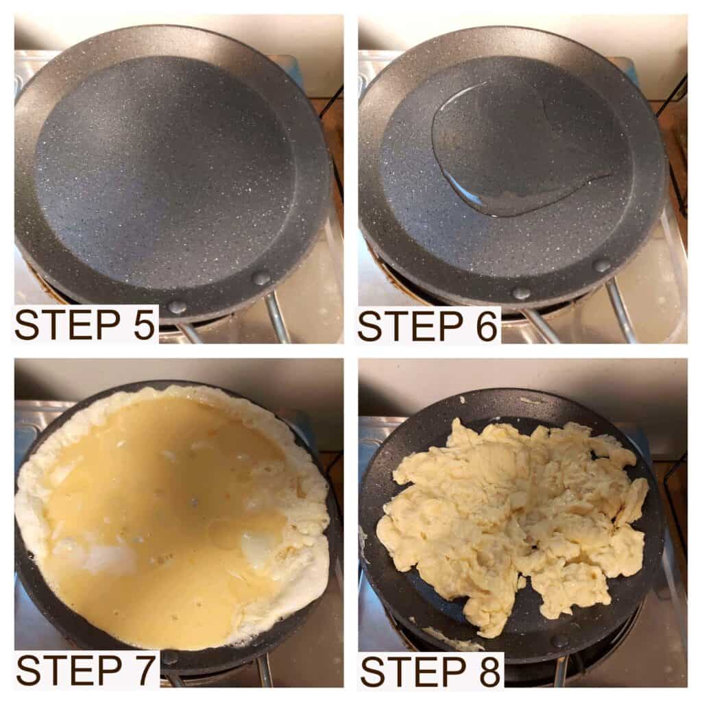 - In a non-stick pan in medium-low heat, add two tablespoons of vegetable oil and when it’s hot, pour the beating egg.