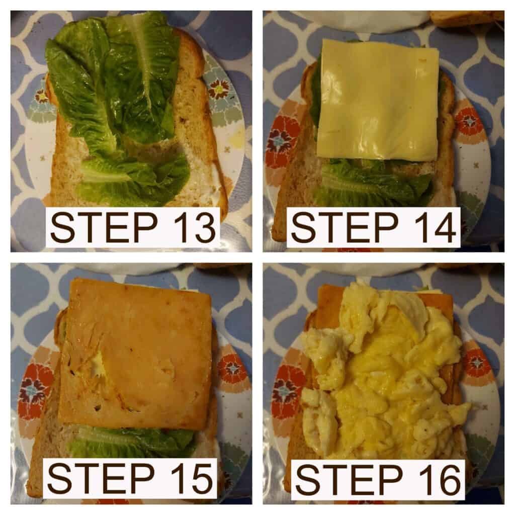 - Add the lettuce, followed by cheese, ham, and then scrambled egg.