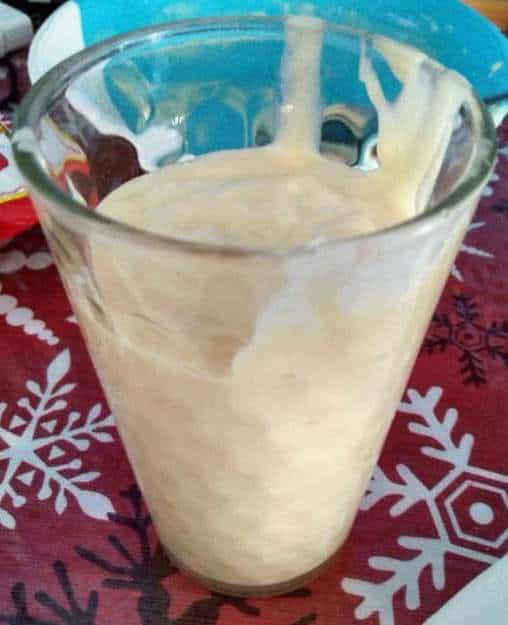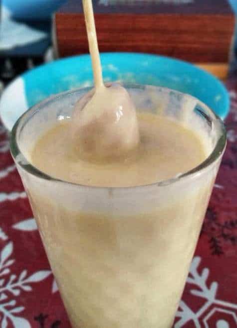 Next, I transfer and pour the milk yeast mixture into the bowl. Mix gently using the spoon until it is fully dissolved. Transfer into a tall glass for preparing on coating the corn dog.