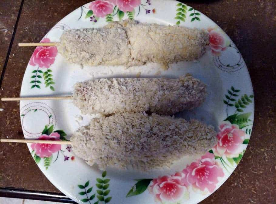 - Transfer the Batter into a tall glass or shallow pan (whichever you prefer). Dip the hotdog cheese in a wooden chopstick into the batter, Roll in one direction until it is fully coated.