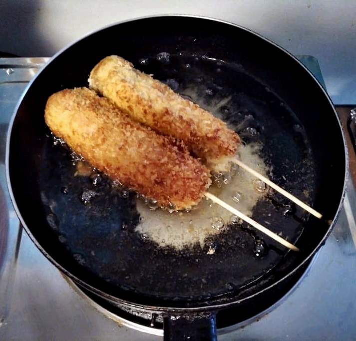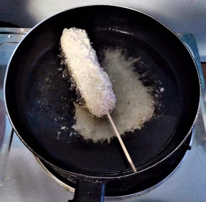 - Make sure the corn dog is fully covered by the breadcrumb to prevent the cheese from leaking out when frying.