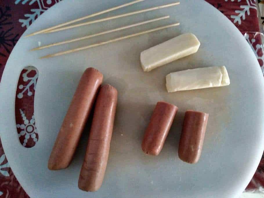 - Cut the Mozzarella cheese into 3 inches long with the same width as the hotdog. Divide the jumbo hotdog into 2 pieces.