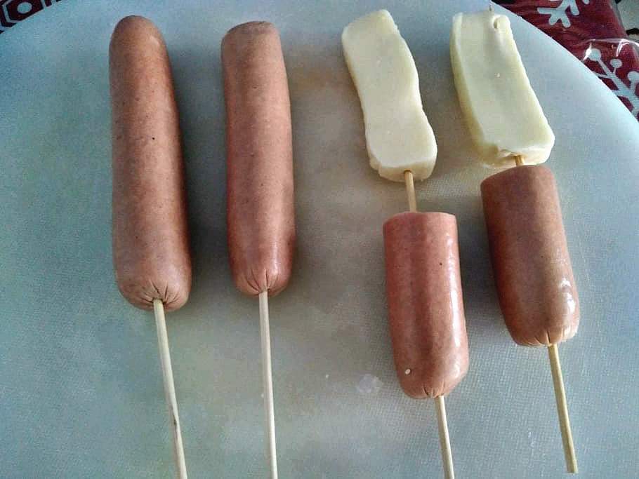 - Assemble the hotdog and cheese into the wooden chopstick. The cheese should be placed above the hotdog