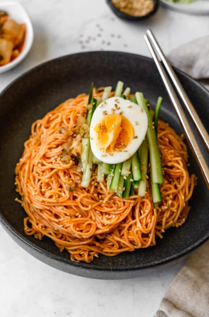 Bibimmyeon, or Bibim Guksu, is perfect for a hot day! Chewy wheat noodles are chilled and coated in a spicy gochujang sauce. It's topped with kimchi, cucumber, and a hard-boiled egg. This easy vegetarian Korean dish is tangy, spicy, and light yet satisfying.