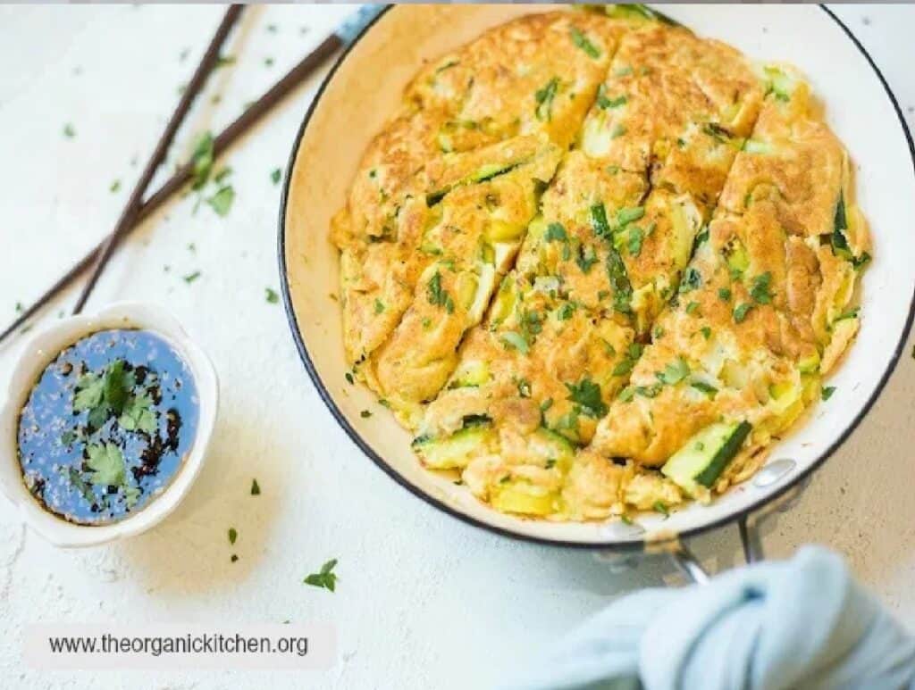This hobakjean is a Korean zucchini pancake which is a traditional Korean breakfast that is commonly served with a dipping sauce.