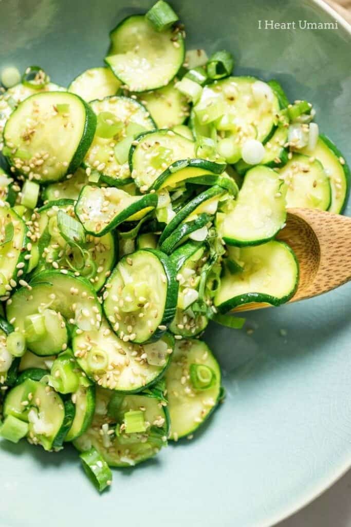 This chilled Korean side dish made with zucchini is simple to make and vegetarian-friendly. With toasted sesame oil and sprinkles of toasted sesame seeds, it tastes even better the next day