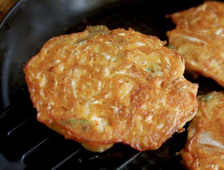 Mung bean pancakes are vegetable-filled pancakes that contain spring onions, bean sprouts, and kimchi that are made from a super easy-to-make mung bean batter. It is easily made vegetarian, or even vegan, to please everyone at dinner.