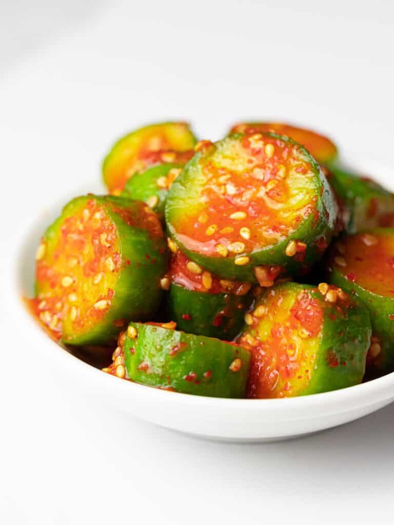 Oi Muchim is a spicy Korean cucumber salad that is tangy, sweet, salty, and crunchy! It’s an easy recipe made with pickled cucumbers and Korean red pepper flakes for some spice!