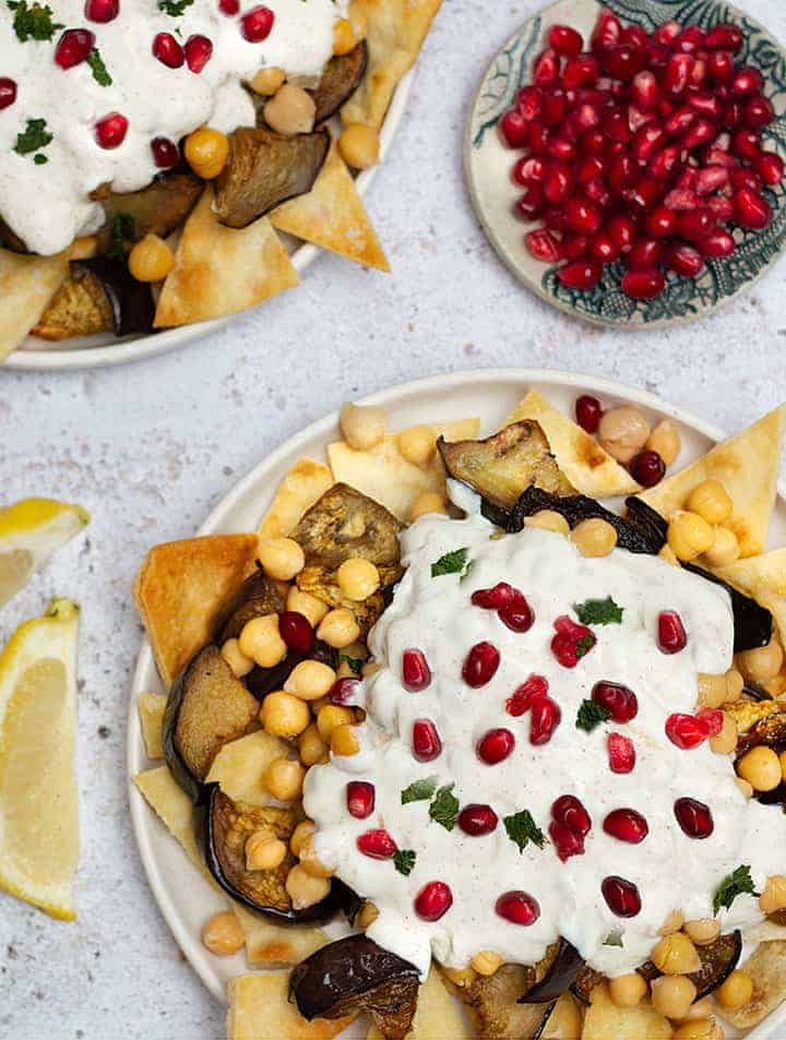 Fatteh is a Lebanese salad which is mixed with crunchy fried pita bread, spicy chickpeas, eggplant and yogurt.